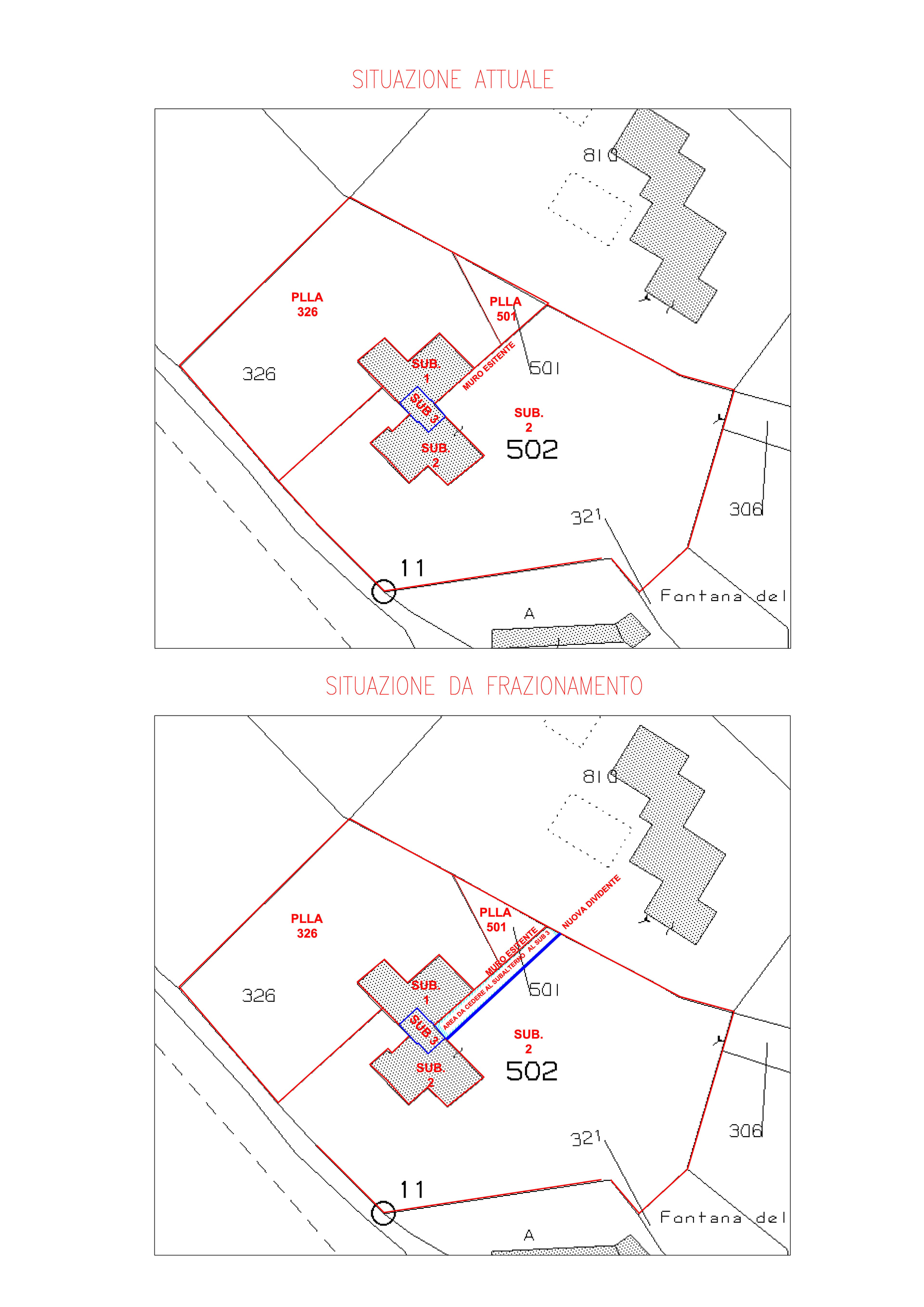 Innanzitutto il lotto in questione è identificato in modo molto strano!! Sembra che la particella 502 sulla quale insiste il fabbricato subalternato sia condominiale e che il mappale 326 sia esclusivo al sub.1. Dovrebbe sussistere un elaborato planimetrico che individua il sub. 2 sia come fabbricato che come corte esclusiva, pertanto al 99 % si procederà modificandolo opportunamente.