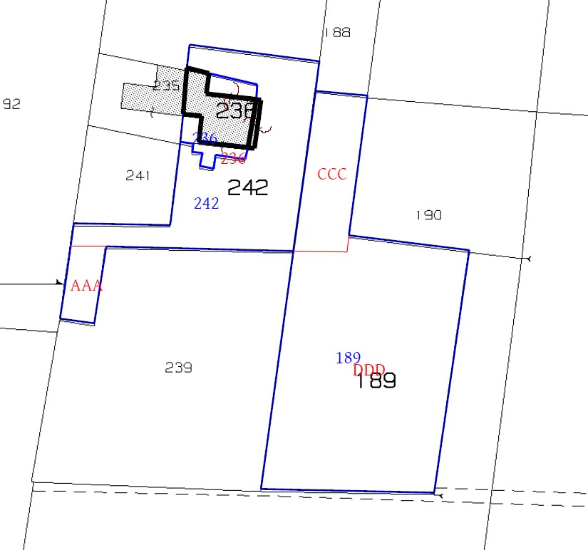 Non si vede bene ma i mappale 242 ha una piccola porzione di fabbricato in aderenza al 236 motivo per cui era più corretto fonderli insieme ora che le ditte sono le stesse. Nella compilazione dei dati relativi all’ente urbano ho indicato inizialmente sub.0 altrimenti rimaneva in rosso la legenda. Ho provato a rielaborare Pregeo senza la compilazione di questo campo e sembra girare. La compilazione automatica mette comunque sub.0. Vediamo!