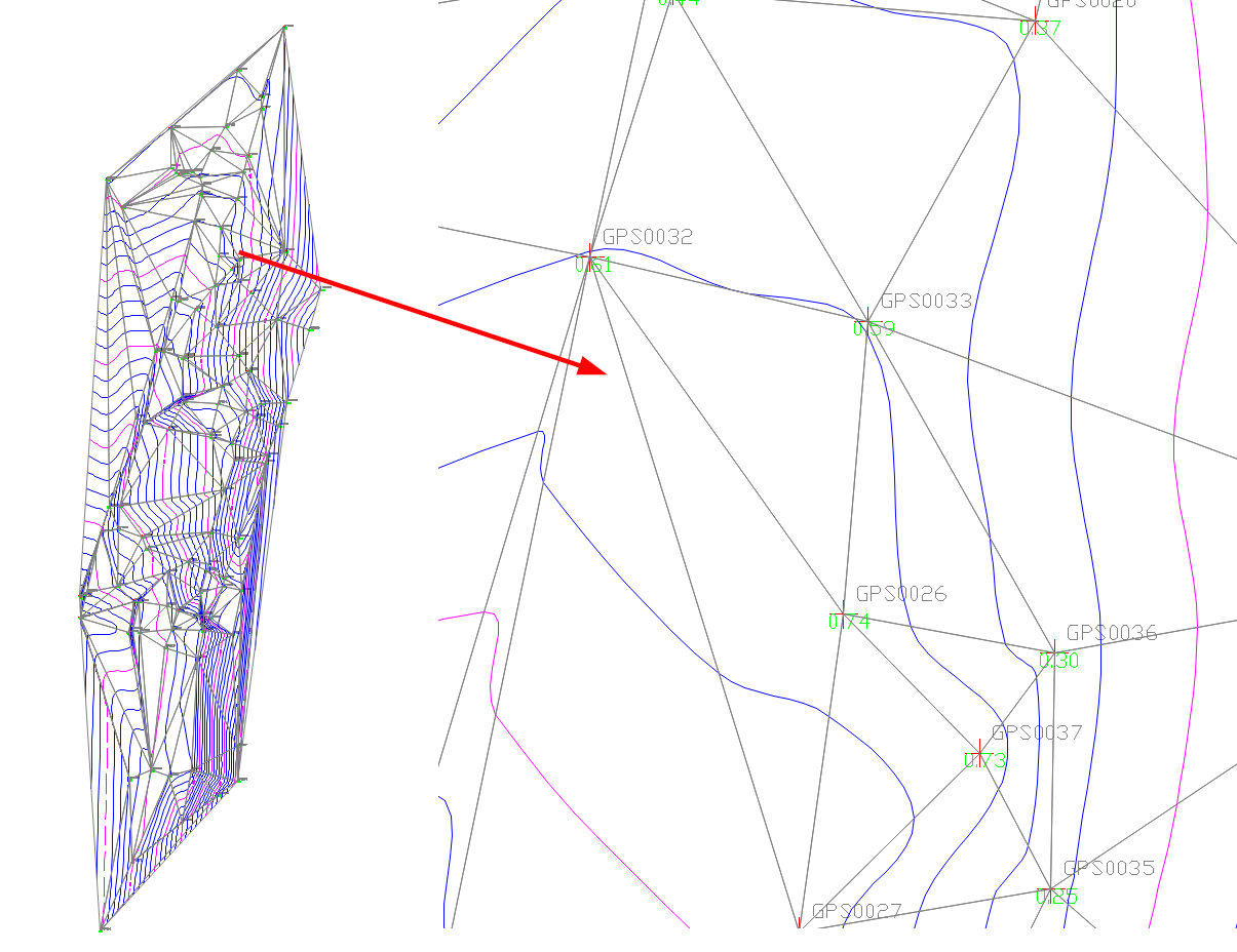 e ottieni sul CAD il disegno del piano quotato completo di punti, quote, triangoli e curve di livello (vedi qui sotto):