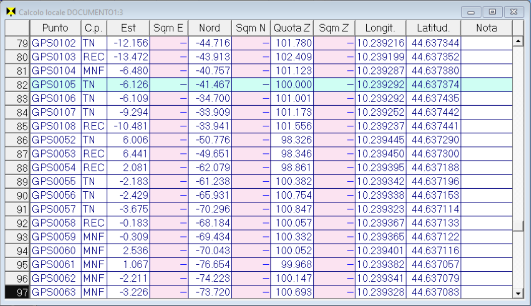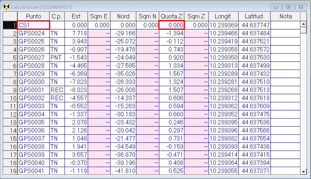 A questo punto puoi procedere con le elaborazioni. Ad esempio se attivi il calcolo locale (menù clic destro) ottiene le coordinate riferite alla base locale che hai scelto (CS1). Ovviamente anche le quote sono riferite alla quota di questa base assunta come 0.000: