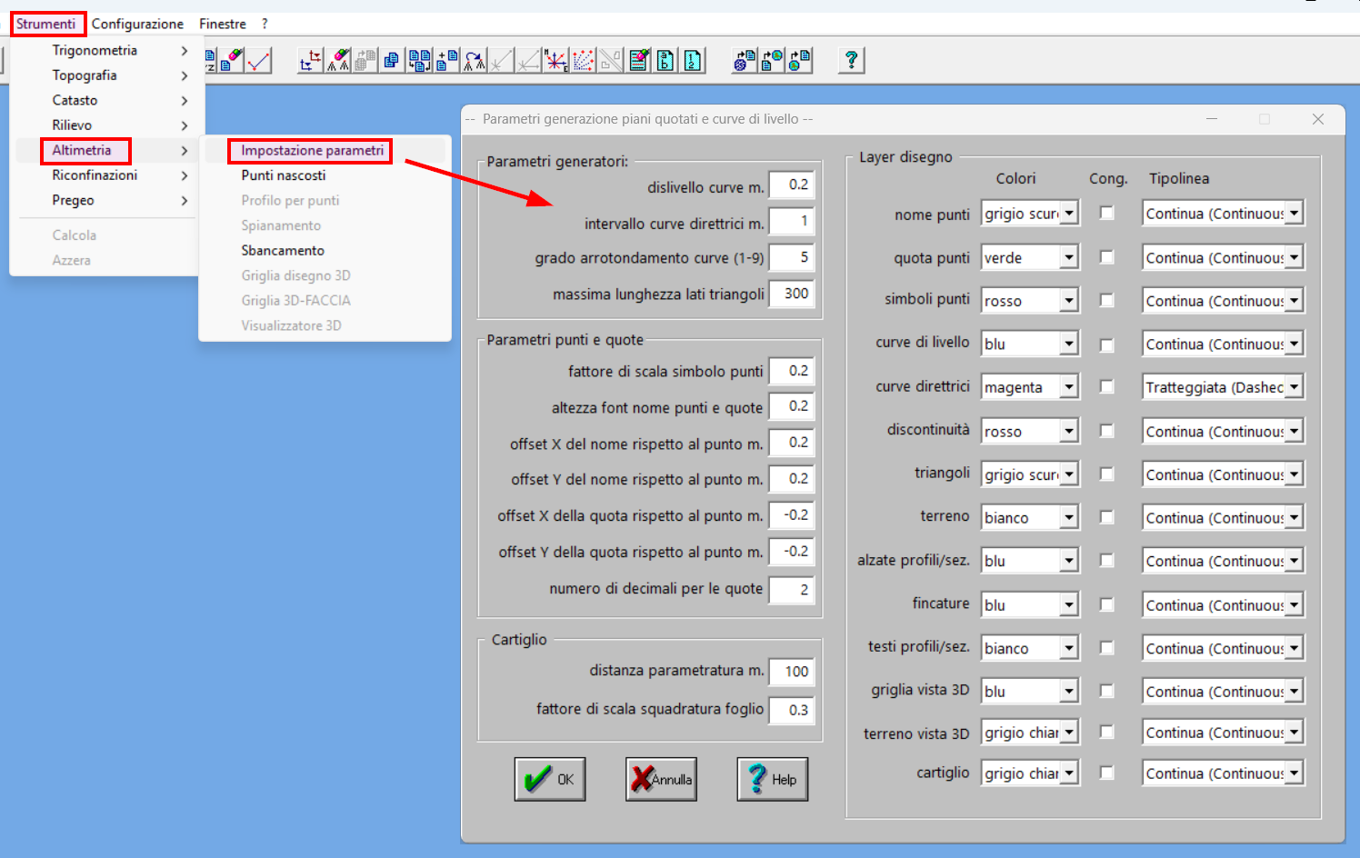 Passiamo alla parte altimetrica. La prima cosa che devi fare è attivare il menù Strumenti | Altimetrica | Impostazione parametri per impostare i parametri per la generazione dei piani quotati e a curve di livello: