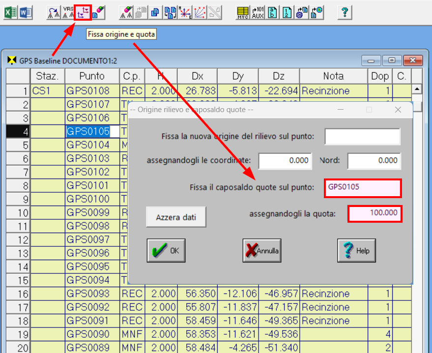 Se invece vuoi avere le quote riferite ad un tuo punto di caposaldo, devi fare così: dalla tabella GPS attiva l’icona Fissa origine e quota, si apre la relativa finestra nella quale inserisci il nome del punto di caposaldo e la quota da assegnargli (qui ad esempio GPS0105 a quota 100,000):