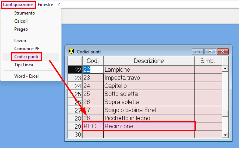 Come puoi vedere dalla tabella GPS sopra, tutti i punti ai quali tu nel rilievo hai attribuito il codice REC riportano nella colonna Nota la dicitura Recinzione. Questo è avvenuto perché io nella tabella che si apre dal menù Configurazione | Codici punti ho inserito (alla fine della tabella) la riga che associa quel codice a quella descrizione.