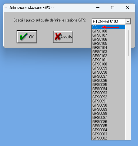 Poi importa il file XML come sai già fare. Come ti dicevo, Geocat ti propone quale base del rilievo la stazione permanente della rete NRTK, ma in questo tuo rilievo questa è a oltre 20 km, quindi ti conviene selezionare un punto locale altrimenti vai fuori dal campo topografico e puoi introdurre approssimazioni eccessive. Io qui, ad esempio, ho impostato il punto CS1.