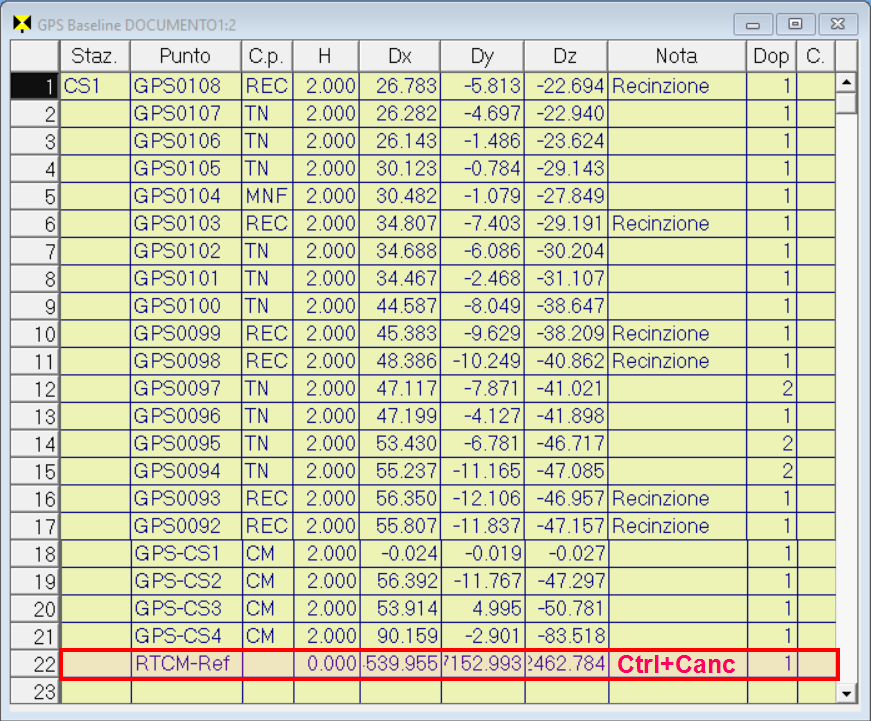 Inoltre, una volta importato il rilievo (e salvato con un nome effettivo), vai sull’ultima riga dove trovi la stazione di rete (presente come se fosse un punto rilevato) e cancella la riga premendo Ctrt+Canc da tastiera, altrimenti nel disegno CAD avresti sempre questo punto lontanissimo.