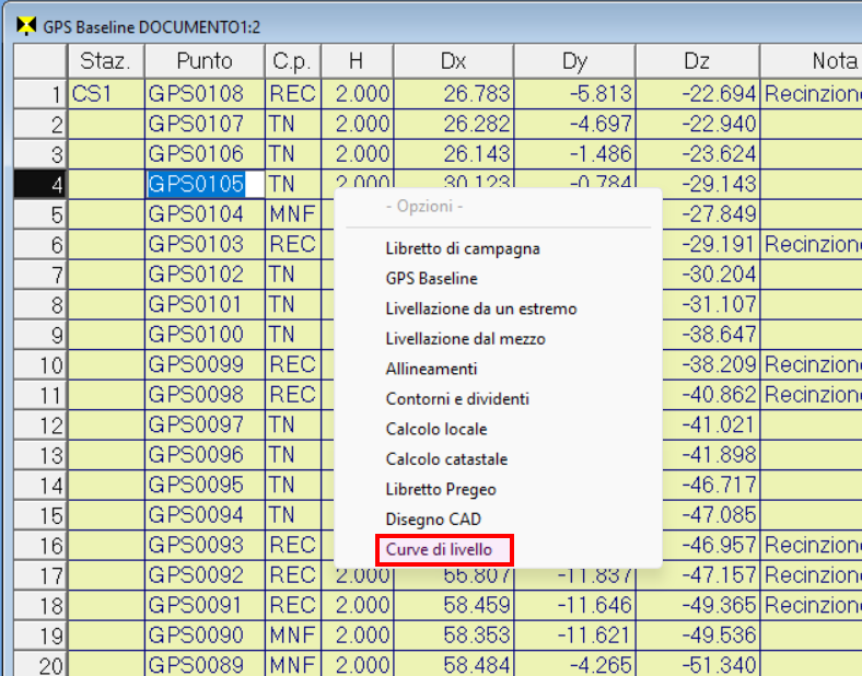 Dopodiché dalla tabella GPS attivi l’opzione Curve di livello del menù clic destro: