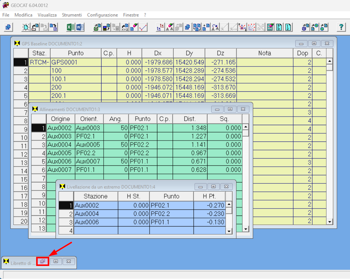 Ti troverai così importato il rilievo GPS, inclusi gli allineamenti per intersezioni per gli spigoli dei fabbricati (PF) e le pseudo-livellazioni per attribuire la quota a tali punti, mentre la tabella TS (che non ha dati) viene minimizzata su una barretta nell’angolo in basso a sinistra dello schermo. A questo punto, clicca sull’icona dei due quadretti della barretta così riapri la tabella: