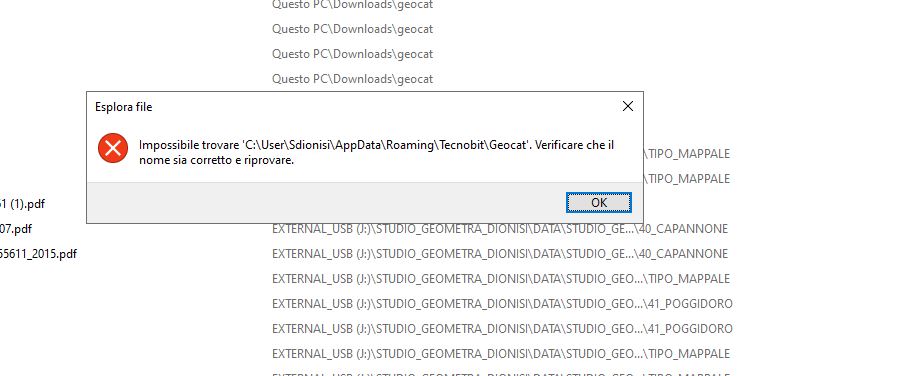 c’è una qualche impostazione sul tuo computer che impedisce all’installazione di Geocat di creare la cartella che segnala il primo messaggio. Di solito è perché la cartella C:\User\Sdionisi\AppData (e le sue sottocartelle) sono protette da scrittura. Se non riesci a togliere la protezione da scrittura, chiamami che fissiamo una vide-assistenza e sistemiamo noi.