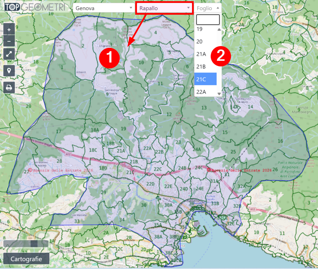 Dopo aver selezionato il Comune dall’apposita casella a discesa, viene evidenziata sulla cartografia la geometria del confine comunale: