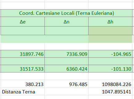 Buongiorno, in effetti la zona dovrebbe essere lido di Venezia da calcolo sulle geocentriche, ho provato a sviluppare la terna euleriana e la distanza in effetti mi viene da 1047.895, penso sia proprio perché siamo a cavallo tra i due fusi GB 33 / 32, provando con software sul fuso 32 la distanza GB viene di 1048.031 e sul fuso 33 mi viene da 1048.374, allego immagini, però dal corso sono un po’ arrugginito e magari mi sono perso un po’. Saluto intanto