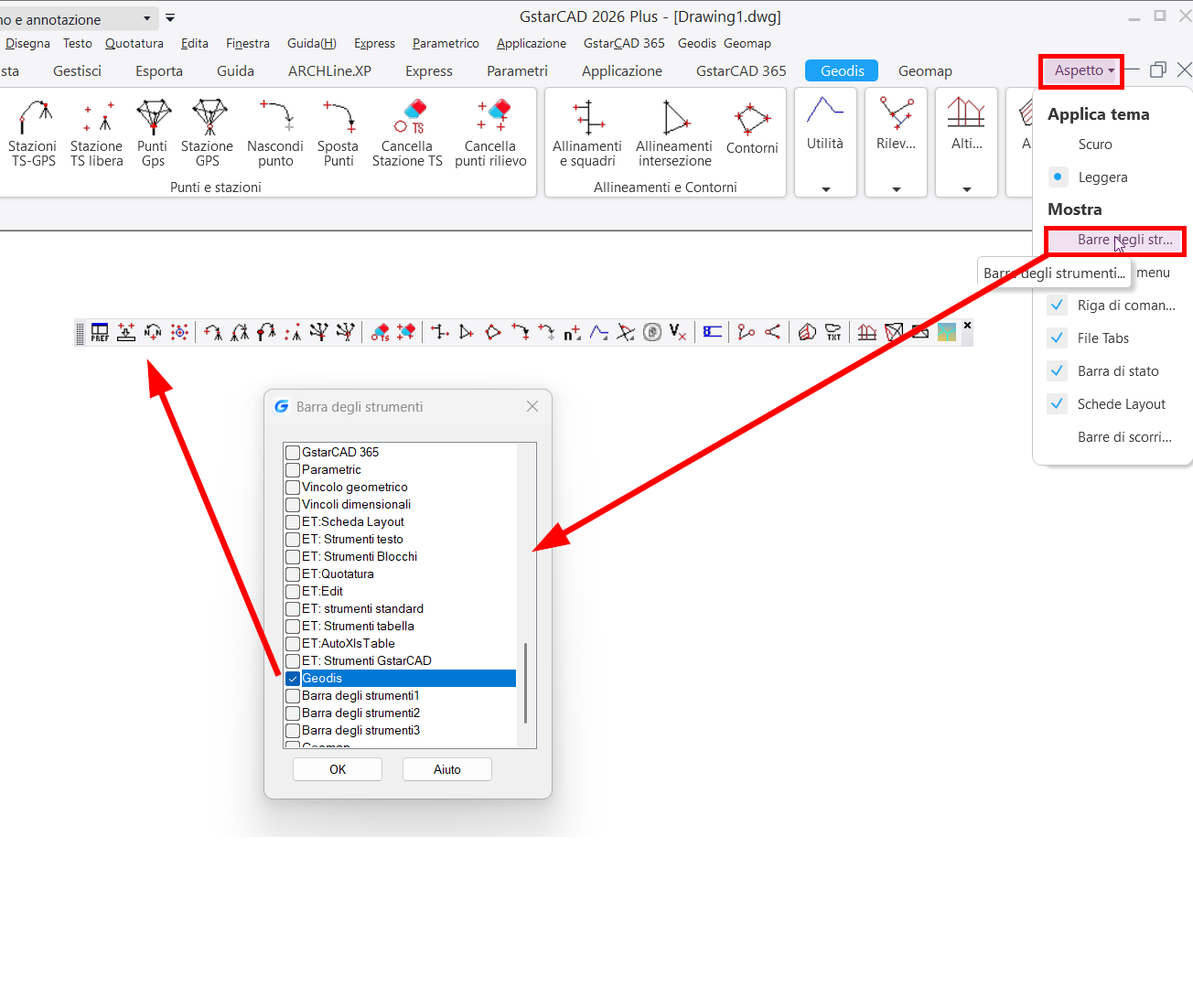 apri il menù Aspetto in alto a destra e attiva l’opzione Barre degli strumenti, si apre la lista con tutte le applicazioni, seleziona Geodis e ti appare la barra che puoi ancorare sui bordi dove vuoi: