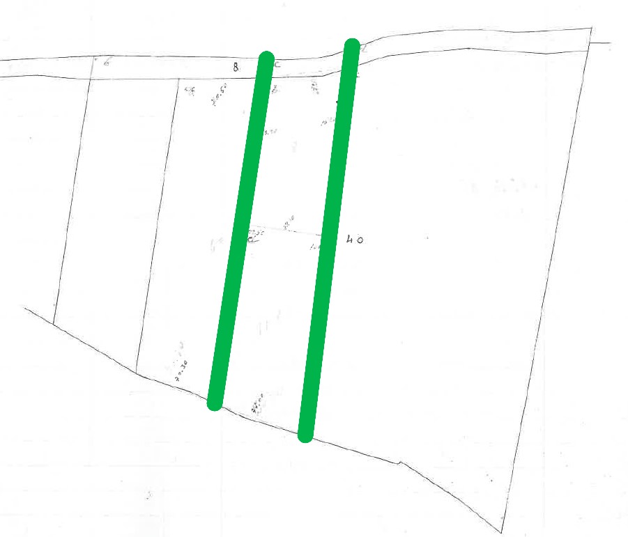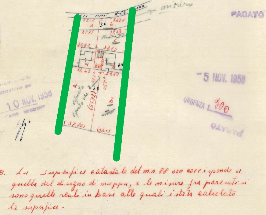 - Sul posto le linee verdi indicano degli scoli (presumibile pensare fossero già esistenti nel 1958 al momento del frazionamento vista la nota del tecnico)
