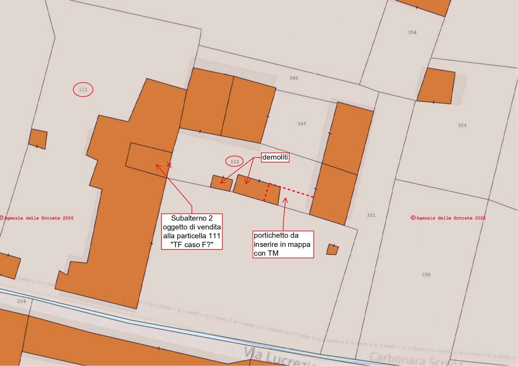 Il fabbricato “inglobato” nella particella 111 adiacente (particella 112 subalterno 2) dovrà essere frazionato dalla corte comune per poi essere trasferito con atto notarile al proprietario della particella 111.